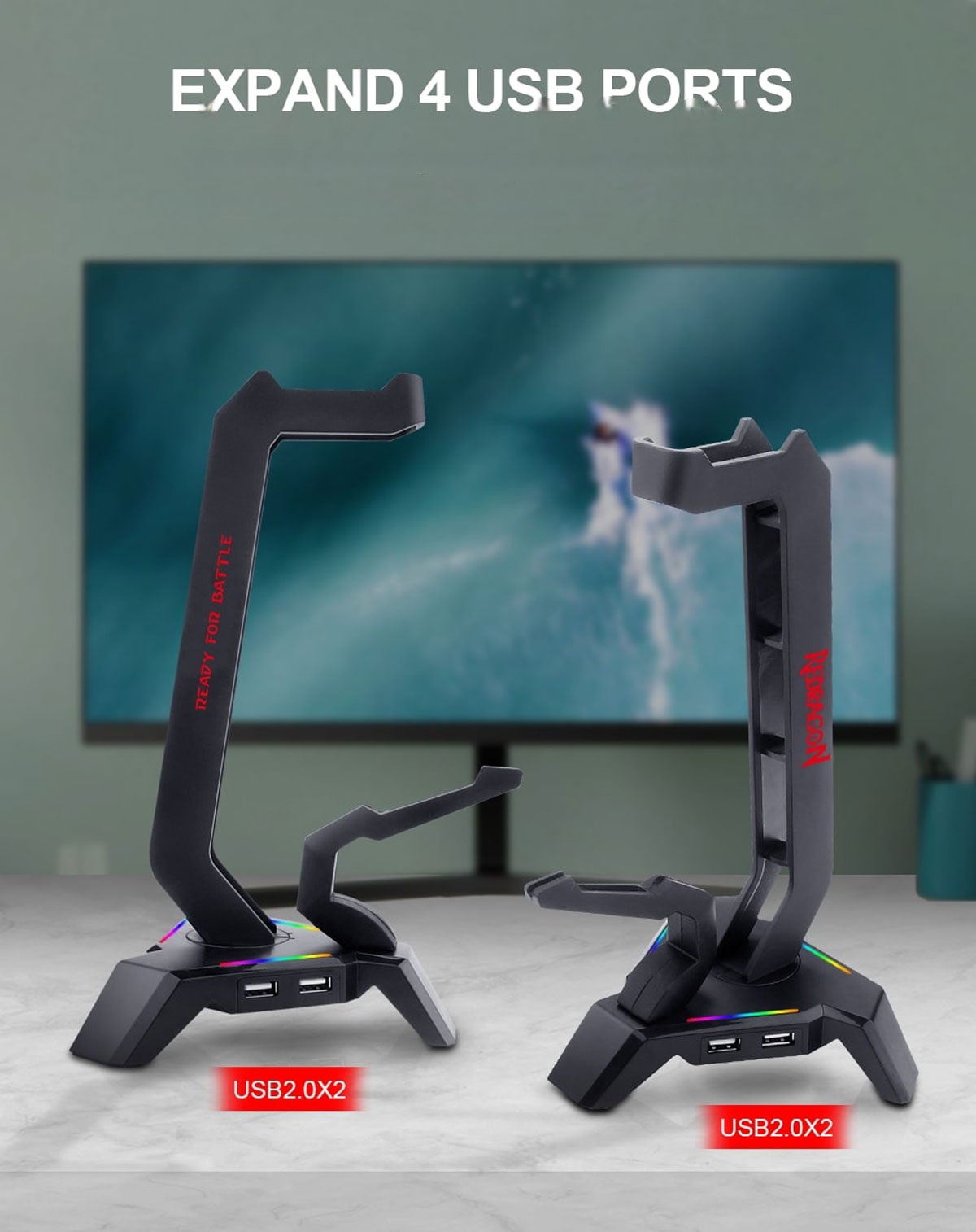 پایه نگه دارنده هدست REDRAGON SCEPTER HA311 با نور پردازی RGB، بانجی موس و 4 عدد پورت USB2.0، که با کاربردهای متنوع در قسمت پایینی آن وجود دارد، از نکات مثبت در طراحی آن می باشد. بهره گیری از نورپردازی RGB و پایه های لاستیکی برای جلوگیری از لغزش در این استند جزء نکات قابل توجه آن محسوب می شود.