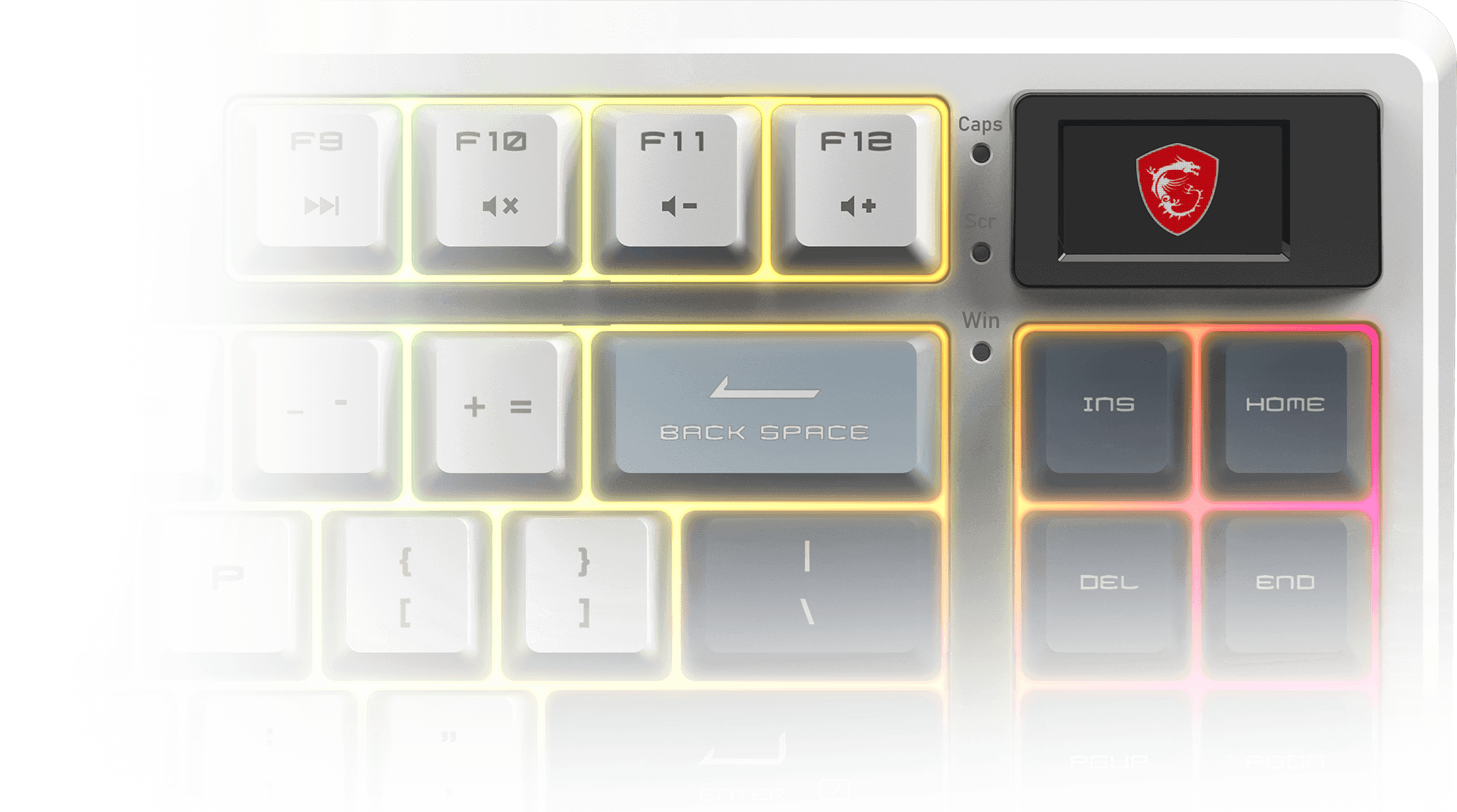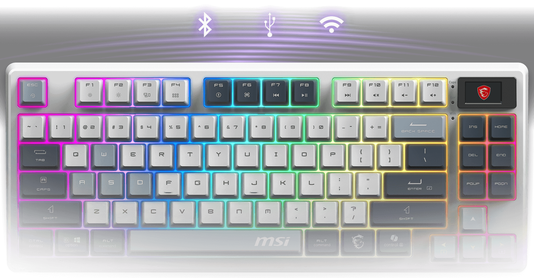 MSI FORGE GK600 TKL SKY با یک صفحه نمایش 1.06 اینچی کاربردی، اطلاعات مهمی مانند میزان باتری باقیمانده و تنظیمات فعال را به شما نمایش میدهد. این ویژگی به شما کمک میکند تا همیشه از وضعیت کیبورد خود آگاه باشید و در لحظات حساس بازی، نگران تمام شدن شارژ نباشید. علاوه بر این، کلیدهای مدیای اختصاصی به شما امکان میدهند تا به راحتی میزان صدا، پخش موسیقی و ویدئو را کنترل کنید بدون اینکه نیاز به خروج از بازی یا برنامه داشته باشید. این کلیدها به شما کمک میکنند تا تمرکز خود را روی بازی حفظ کرده و در عین حال، به راحتی به قابلیتهای چندرسانهای دسترسی داشته باشید.