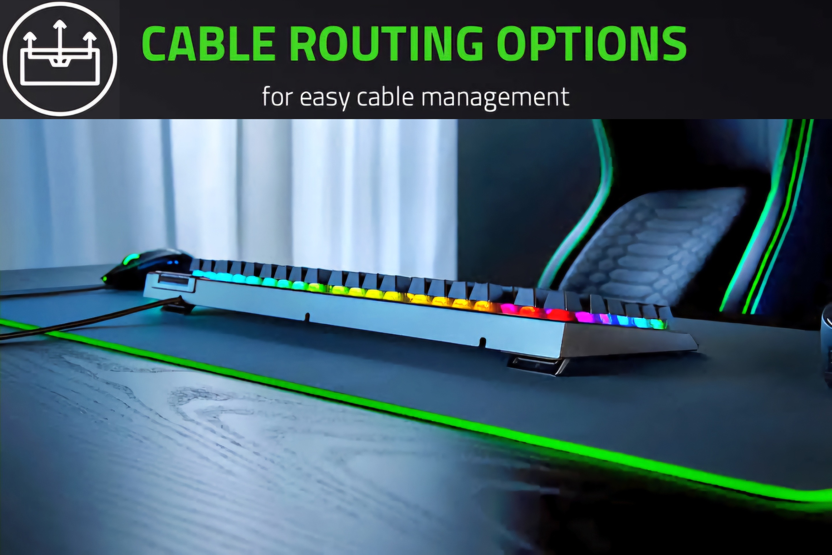 در گیمینگ، پایداری اتصال حرف اول را میزند. کیبورد RAZER BLACKWIDOW V4 X از رابط باسیم بهره میبرد که از طریق یک کابل باکیفیت به پورت USB دستگاه شما متصل میشود. طول مناسب کابل و طراحی (CABLE ROUTING OPTIONS) به شما آزادی عمل کافی برای مدیریت کابلها بر روی میز را میدهد. استفاده از اتصال باسیم باعث میشود تا هرگونه احتمال تداخل امواج یا تاخیر ورودی که در مدلهای بیسیم شایع است، به کلی حذف شود. همچنین، این نوع اتصال نیاز به شارژ کردن باتری یا نگرانی از بابت تمام شدن شارژ در وسط بازی را از بین میبرد.