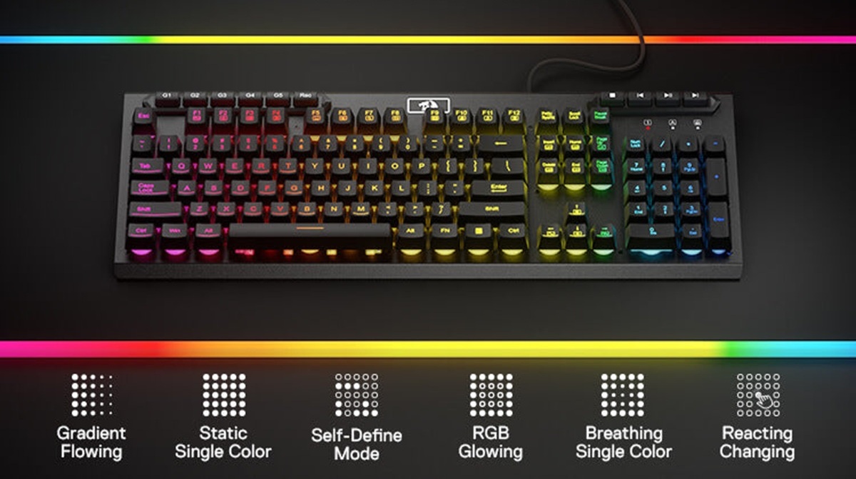 کیبورد REDRAGON K513 ADITYA به نورپردازی RAINBOW مجهز شده که قابلیت تنظیم آن را دارید. این کیبورد با 6 حالت نورپردازی از پیش تعیین شده و قابل تنظیم ارائه میشود. همچنین، میتوانید شدت نور را نیز تنظیم کنید و در صورت نیاز، نورپردازی را به طور کامل خاموش کنید. این نورپردازی جذاب، هیجان بازی شما را دوچندان میکند و به شما کمک میکند تا در دنیای بازیها غرق شوید.