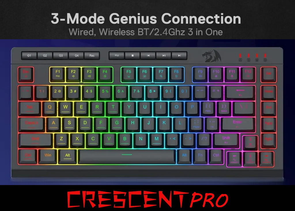 کیبورد CRESCENT PRO دارای 4 کلید ماکرو قابل برنامهریزی (G1-G4) است که به شما امکان میدهد ماکروهای دلخواه خود را روی آن ها ضبط کنید و با یک کلیک اجرا کنید. این کلیدها قابل برنامهریزی هستند و به شما کمک میکنند تا در بازیها و برنامهها بهرهوری خود را افزایش دهید.