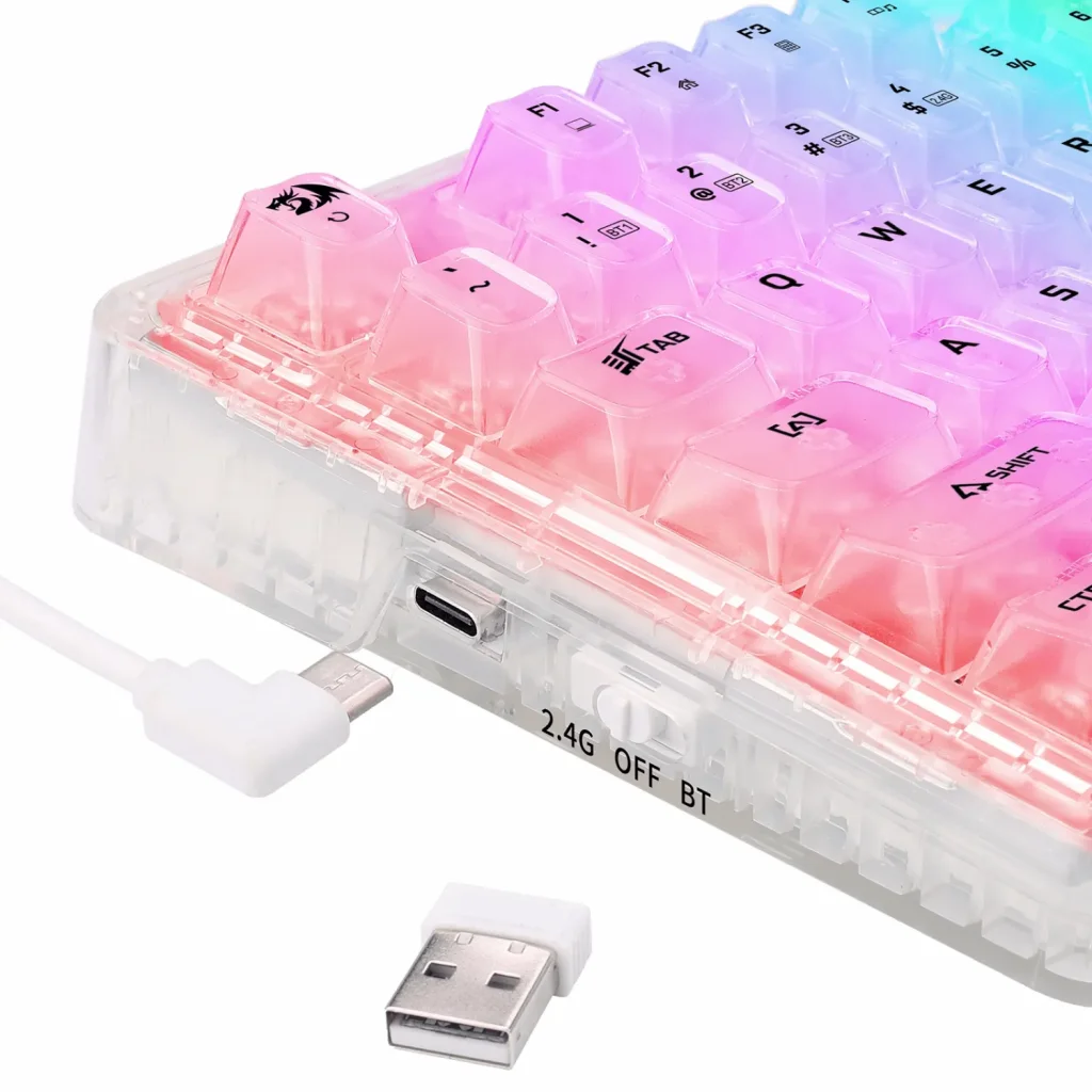 یکی از مهمترین ویژگیهای کلیدی این کیبورد، سیستم اتصال سهگانه آن است که به شما آزادی عمل بینظیری میدهد. شما میتوانید با استفاده از دانگل 2.4 گیگاهرتز، اتصالی بسیار سریع و با کمترین تأخیر را برای بازیهای رقابتی تجربه کنید؛ تجربهای که تقریباً هیچ تفاوتی با اتصال سیمی ندارد. همچنین، با قابلیت بلوتوث، بهراحتی میتوانید کیبورد را به تبلتها، گوشیهای هوشمند یا لپتاپهای مختلف متصل کنید و به امور روزمره خود بپردازید. در نهایت، برای شارژ یا اطمینان کامل از پایداری اتصال، پورت USB-C امکان اتصال سیمی و شارژ سریع را فراهم میکند. این تنوع درگاه اتصال (باسیم - بیسیم) باعث میشود REDRAGON ELF PRO انتخابی چندمنظوره برای کار، تایپ و گیمینگ باشد.