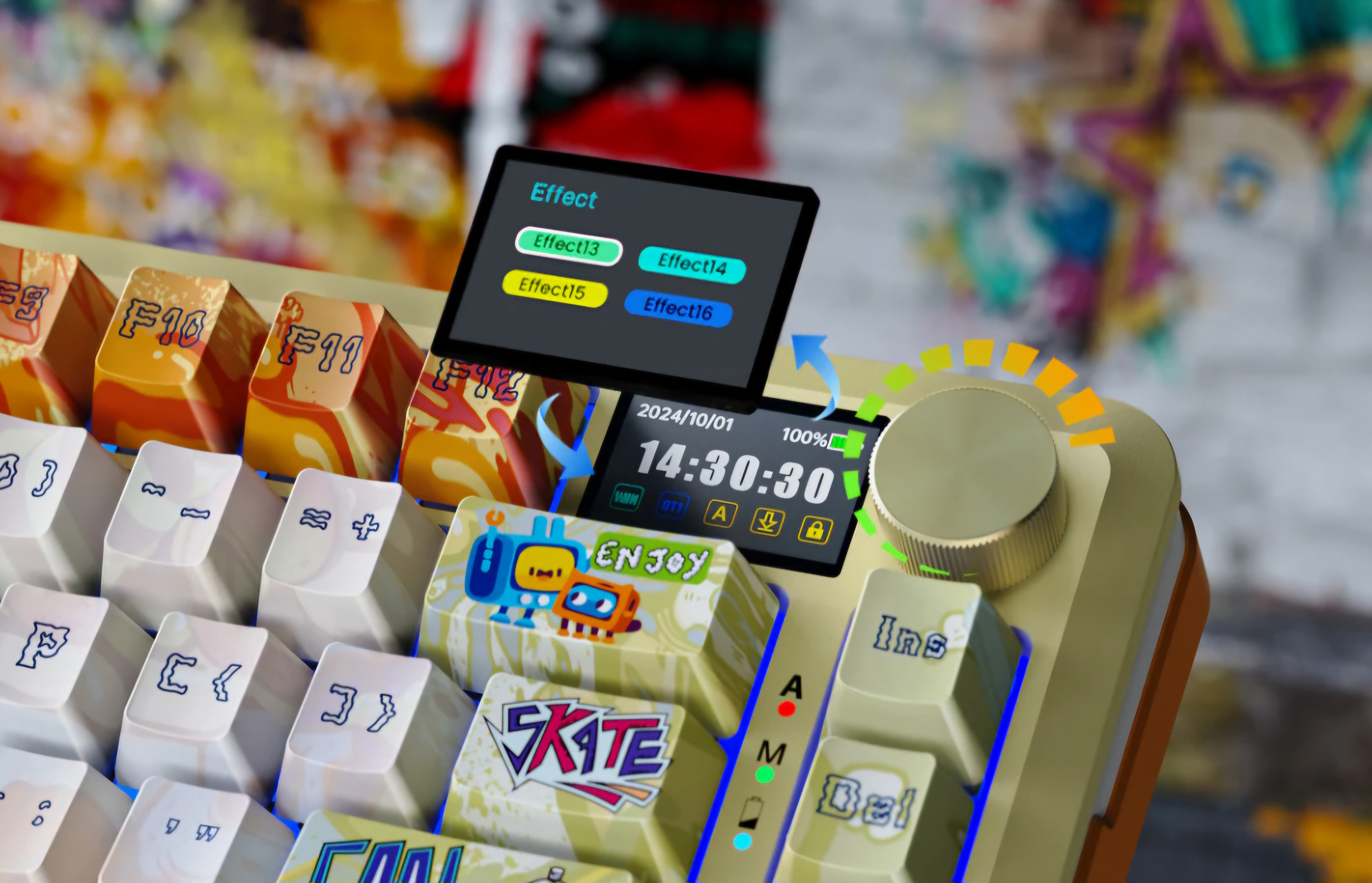 ویژگی منحصر به فرد K708 GF PRO وجود نمایشگر 1.14 اینچ است. این صفحه نمایش کوچک، کاربری کیبورد را از یک ابزار ورودی ساده به یک مرکز اطلاعاتی تبدیل میکند. شما میتوانید اطلاعات مفیدی مانند ساعت، تاریخ، وضعیت اتصال (دانگل یا بلوتوث)، و سطح شارژ باتری را به راحتی مشاهده کنید. این نمایشگر نه تنها به زیبایی کیبورد میافزاید، بلکه به گیمرها کمک میکند تا بدون خروج از بازی و یا استفاده از نرمافزار جانبی، وضعیت کلیدی دستگاه خود را تحت نظر داشته باشند و در مصرف انرژی باتری مدیریت بهتری داشته باشند.