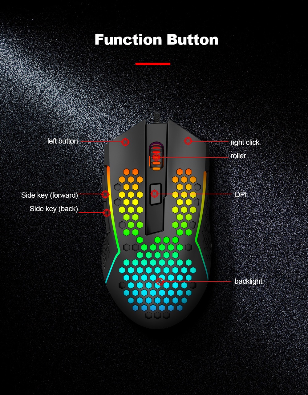 یکی از ویژگیهای برجسته موس ردراگون Reaping M987-K، وزن فوقالعاده سبک (Ultra Weight Design) آن است. این موس تنها 55 گرم وزن دارد (بدون در نظر گرفتن کابل)، که برای یک موس گیمینگ کاملاً بینظیر است. این وزن سبک به گیمرها این امکان را میدهد که در طول جلسات طولانی بازی، بدون احساس خستگی یا سنگینی در دست، به راحتی به حرکات سریع و دقیق دست یابند. ساختار لانه زنبوری بدنه این موس به آن ظاهر خاص میبخشد، همچنین به تهویه بهتر دست کمک میکند و از تعریق جلوگیری میکند، که این امر در بازیهای طولانی مدت بسیار مهم است.