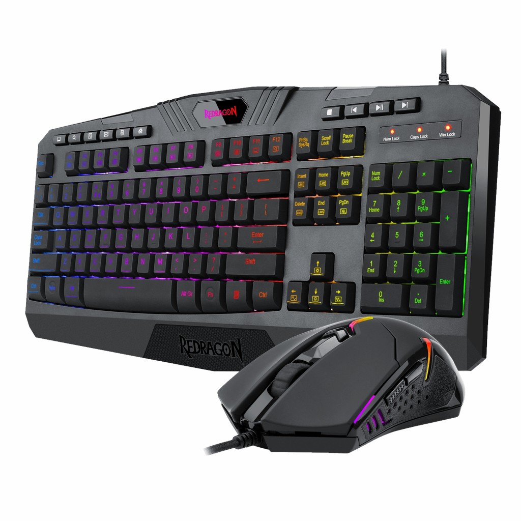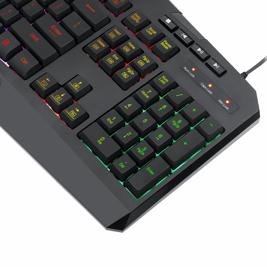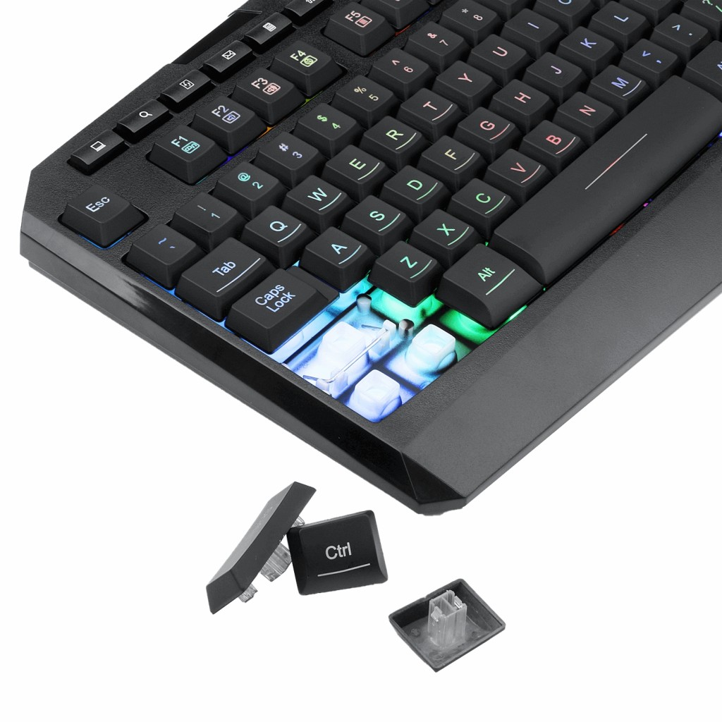 یکی از ویژگیهای برجسته کیبورد موجود در این باندل، بهرهمندی از چیدمان کامل یا Full-size است. برخلاف مدلهای فشرده، این کیبورد دارای 104 کلید استاندارد است که تمامی بخشهای مورد نیاز کاربر، از جمله بخش اعداد (Numpad) را شامل میشود. وجود این بخش برای کاربرانی که علاوه بر بازی، به فعالیتهای محاسباتی، حسابداری یا وارد کردن دادهها مشغول هستند، یک مزیت بزرگ محسوب میشود. بدنه کیبورد از پلاستیک فشرده باکیفیت ساخته شده است که در برابر ضربات ناشی از هیجانات بازی مقاومت خوبی نشان میدهد. فاصله مناسب بین کلیدها نیز باعث شده تا خطای تایپی به حداقل برسد و کاربر بتواند با سرعت بالایی متون خود را تایپ کند. همچنین ویژگی هایی مانند نورپردازی RGB، قابلیت Key rollover همراه با 26 کلید بدون تداخل عملکرد و 4 کلید کنترل مدیا و 6 کلید ماکرو، این کیبورد را برای بازی های RTS، FPS یا MMO ایده آل نموده است
