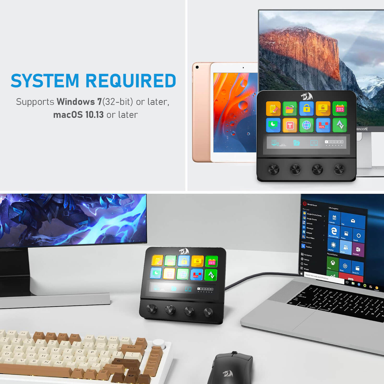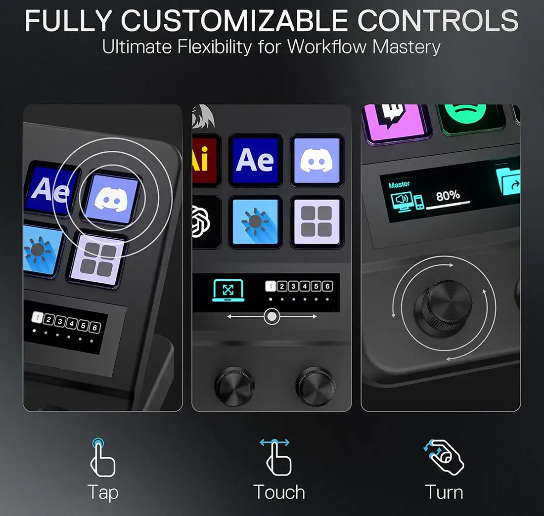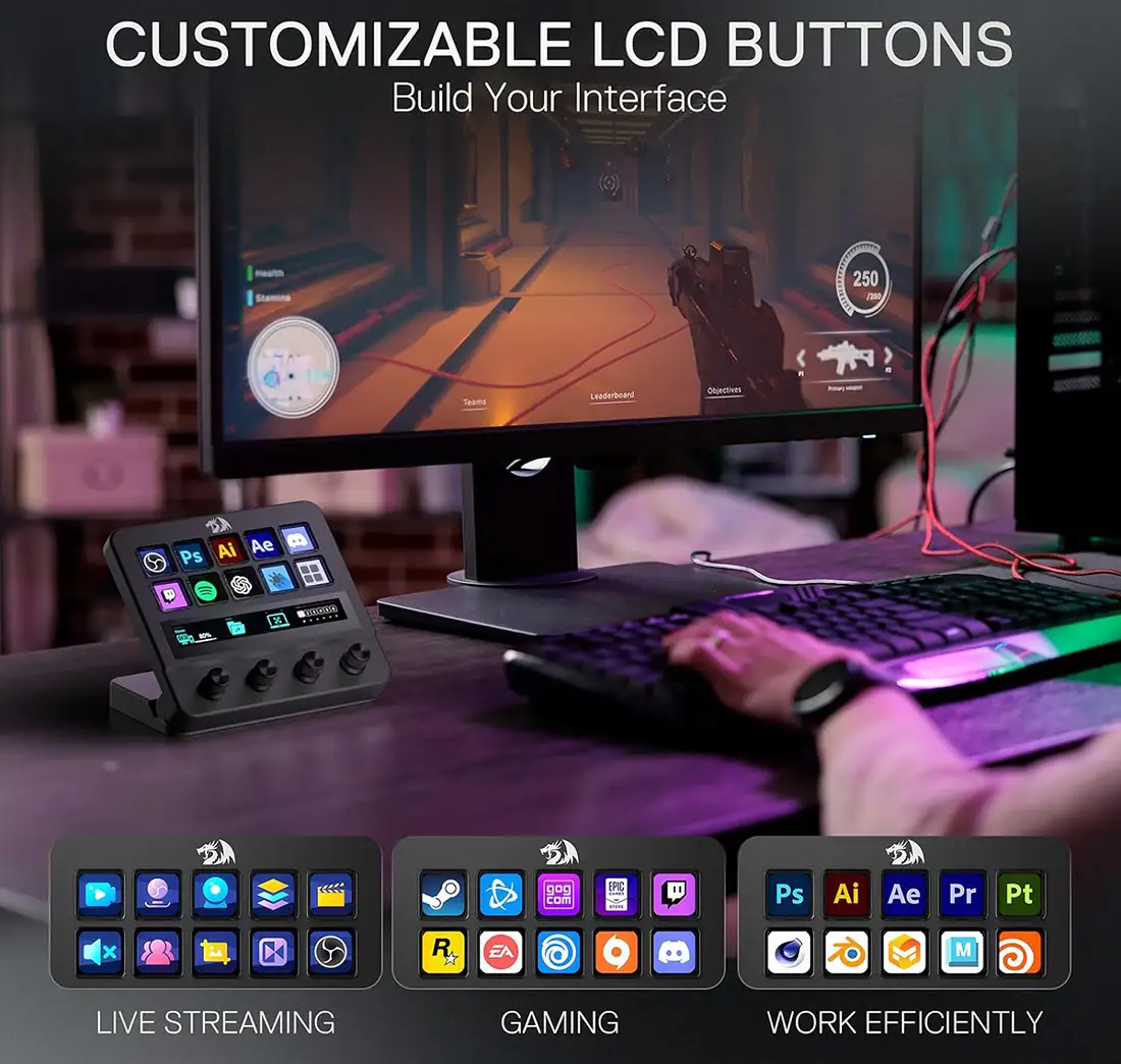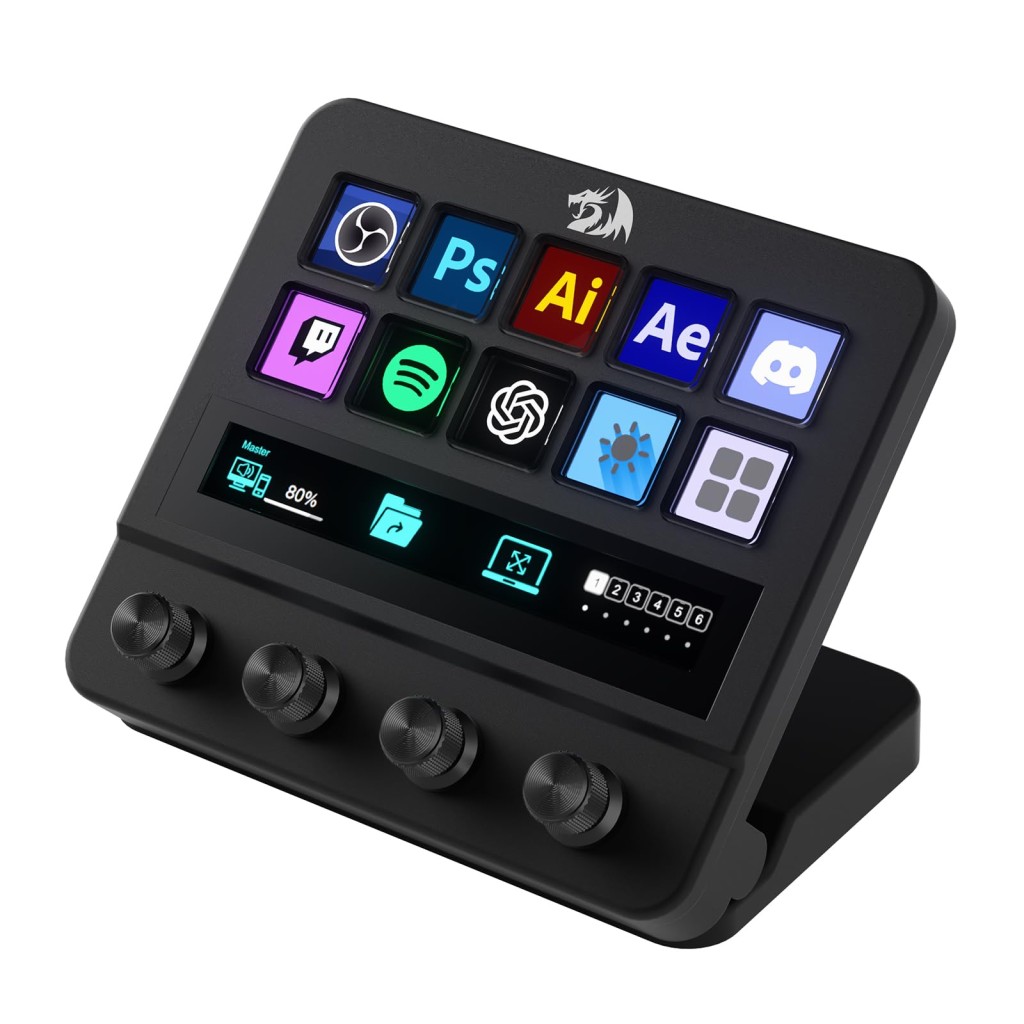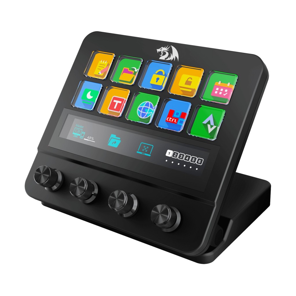 استریم دک Redragon SS-552 Ragnaros دارای 10 دکمهی LCD، ولوم چرخشی و صفحه نمایش لمسی است که هر کدام قابل برنامهریزی و شخصیسازی هستند. این دکمهها به کاربران این امکان را میدهند که به سرعت به عملکردهای مختلف دسترسی پیدا کنند.