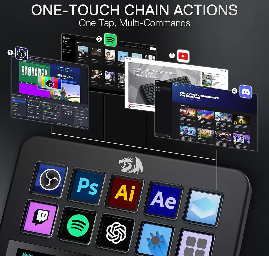 هر دکمهی استریم دک Redragon SS-552 میتواند عملکردهای مختلفی را انجام دهد، از جمله فعال کردن ماکروهای کیبورد و موس، باز کردن وبسایتها، وارد کردن متنهای از پیش تعیین شده یا تکمیل رمزهای عبور، و انجام زنجیرهای از اعمال پیچیده. چنین امکاناتی به کاربران این امکان را میدهد که هر چیزی که تصور میکنند را به راحتی در دستگاه تنظیم و اجرا کنند.