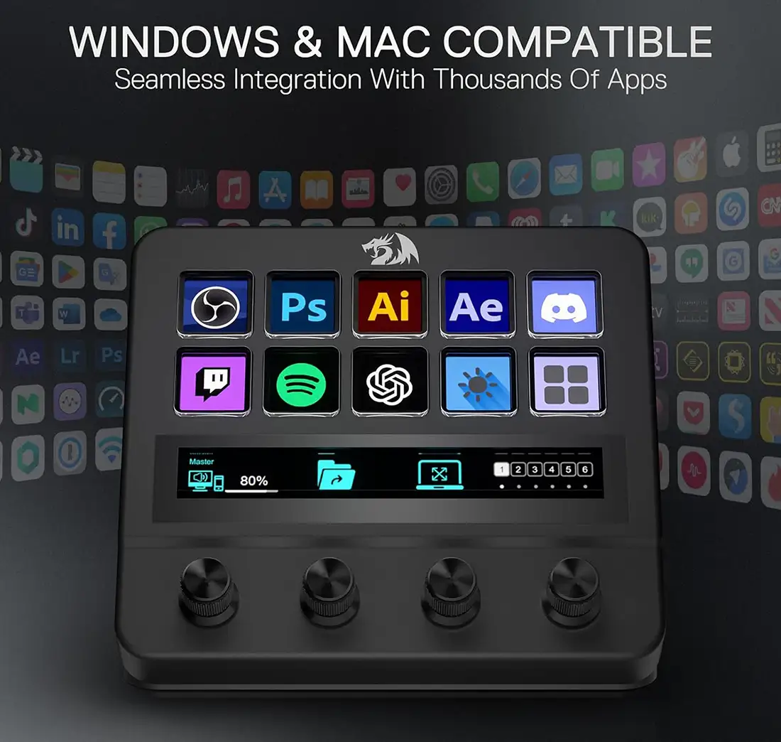 این استریم دک با قابلیتهای ویژهای برای کنترل نرمافزارهای محبوب استریمینگ مانند OBS Studio، vMix و برخی از عملکردهای یوتیوب، به استریمرها امکان میدهد تا به صورت زنده یا در ضبطهای خود، به راحتی و با سرعت بالا مدیریت کنند و کاملا با ویندوز و مک سازگار است.